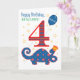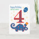 Um divertido cartão de 4º aniversário para personalizar, com um dinossauro fofo, vestindo um chapéu de festa e com um balão amarrado à cauda. O dinossauro (diplodocus) tem bolinhas cor-de-rosa, amarelas e laranja e o número 4 é preenchido com listras de cor clara. A saudação do cobrir principal, em azul para combinar com o dinossauro, é, "Parabéns" com espaço para você adicionar o nome do aniversário da criança. O balão também é azul e tem a palavra "HOJE!" escrita em branco e há pequenas estrelas amarelas sobre o fundo branco. A mensagem dentro é apenas uma sugestão e você pode personalizá-la facilmente se quiser.