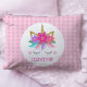 Este travesseiro de unicórnio personalizado apresenta um design de rosto de unicórnio fofo com estrelas e brilho de ouro falso em um fundo de margarida rosa. Personalize-o com um nome. Produtos correspondentes também disponíveis.