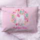 Este travesseiro apresenta um design de unicórnio rosa giro com flores cor-de-rosa e laranja. Personalize-o com um nome.