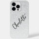 O moderno Silver Glitter Girly Chic Personalized Name iPhone 14 Pro Max Smart Capa de telefone apresenta um fundo brilhante prateado com o seu nome personalizado na elegante tipografia do script de caligrafia escrita à mão. Perfeito como presente para o Natal, aniversário, Dia de as mães, melhores amigos, irmã e muito mais. Elaborado por ©Evco Studio www.zazzle.com/store/evcostudio