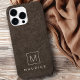 capas de iphone com uma imagem impressa de textura castanha escura de couro e seu nome e monograma iniciais em uma fonte sans serif moderna.