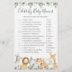 Os animais Safari têm o tema celebridade do chá de fraldas e o cartão de jogos com nomes de bebês apresenta uma ilustração de safari com cores d'água e verde eucalipto garland e uma elegante letra de estilo manuscrito.