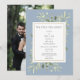 Com delicada folhagem em aquarela num fundo azul empoeirado, este cartão de anúncio de casamento botânico elegante pode ser personalizado com a sua foto especial e detalhes do dia do casamento. Concebido por Thisisnotme©