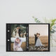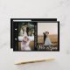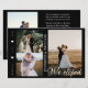 Anuncie seu elogio de casamento aos seus amigos e família por esta carta moderna. O design tem três colagens de fotos na frente com texto branco de caligrafia "nós fugimos" e os nomes das recém-casadas. No verso, você tem uma foto vertical no lado e o casamento detalha o parágrafo do texto no outro lado. Personalize o cartão com suas fotos, detalhes do casamento, data do casamento e nomes.