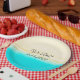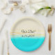 Praia, água azul turquesa, praia arenosa, pratos de papel perfeitos para um casamento com tema de praia ou chá de bebê. O texto diz "Nós Fizemos," e você pode editar a data.