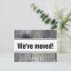 Movendo cartões postais com uma imagem de fundo angustiada do painel de chão de madeira. Texto de movimentação personalizado; nós movemos! Adicione seu novo endereço no verso. Novos cartões modernos para casa e negócios. Design de chão de madeira sujo.