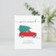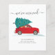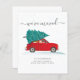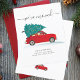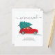 Apresentamos o Anúncio de Movimento de Férias de Natal com um carro vermelho e uma árvore de Natal com script e tipografia popular sobre fundo branco.