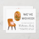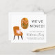 Boho chique econômico para o lar e anúncio de mudança de endereço com ilustrações abstratas de uma cadeira de terracota com uma almofada floral rosa ao lado de uma janela com vista para uma paisagem de terracota de flores cor-de-rosa e um sol. Na frente, personalize com o nome da sua família, o texto "Nós nos mudamos" e seu novo endereço. No verso, você pode personalizar seu anúncio com mais detalhes e incluir um número de telefone e e-mail, se desejar.