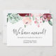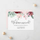 'Nós nos mudamos', elegante cartão de anúncio de flores cor de vinho e rosa em aquarela. Deixe seus amigos e familiares saberem que você finalmente concluiu a compra e onde eles podem encontrá-lo. O cartão pode ser personalizado com a inclusão do nome da sua família e novo endereço. A parte de trás do cartão traz a mensagem 'esperamos ver você em breve' e você pode manter o texto do design como está, editar ou excluir. Uma nova casa equivale a novos começos e novas memórias!