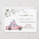 Carro rosa aquarela com presentes e folhas em fundo branco.