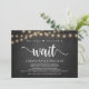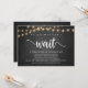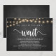 Nós simplesmente não conseguimos esperar, Anúncio de Casamento Furtivo / Cartão de convite, em quadro-negro de fazenda rústica, design de luzes de corda. Isso é perfeito para o seu casamento e festa de celebração pós-casamento. Adicione seus detalhes na fonte / letra correspondente.