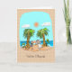 Casal bonito na praia sob as palmeiras que comemora seu elopement recente. Cartão bonito e do divertimento… Personalize este dianteiro e interno tudo que você deseja a.