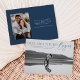 Compartilhe as notícias do seu noivado em estilo com estes anúncios do noivado moderno! O anúncio apresenta a frase "Nossa aventura começa" em letras azuis de marinho de tendência, sobrepondo sua foto horizontal de noivado. Personalize a frente do anúncio adicionando seus nomes e detalhes adicionais. O cartão se reverte para exibir uma foto adicional com espaço para o site do seu casamento ou outras informações.