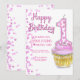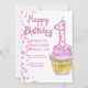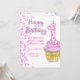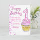 Um feliz convite de aniversário com bolinhas rosa e um cupcake.