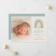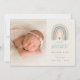 Um belo e sincero anúncio de nascimento para o seu bebê arco-íris apresenta um arco-íris desenhado à mão em cores de tom de terra inspiradas em boho, com o nome do "nosso arco-íris" e o nome do bebê, data de nascimento e estatísticas de natalidade por baixo. Personalize com uma foto em cada lado e adicione uma mensagem pessoal ao verso. Perfeito para os pequenos, bem-vindos depois de uma perda.