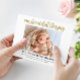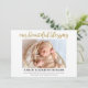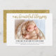 Cartão de nascimento simples e elegante de bebê "Nossa Bênção". Linda letra de escrita com estilo caligráfico e letras de mão em ouro/brilho. 1 foto na orientação horizontal ou horizontal. Substitua a foto pelo seu próprio bebê recém-nascido. Unisex e anúncio elegante do bebê.