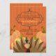 Um convite do aniversário do dia de acção de graças para algum idade ou género. O cartão caracteriza um peru de olhos brilhantes, abóboras e uma laranja e um fundo listrado ouro. Um painel decorativo guardara sua personalização. (FP)
