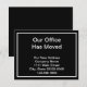 O texto exibido diz 'Nosso escritório mudou de endereço'. Você pode personalizar o anúncio de mudança da sua empresa com o nome da sua empresa, novo endereço e número de telefone. O cartão é preto com texto branco.