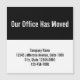"Nosso Escritório se Moveu" está em texto branco grande no topo. Quatro linhas de texto preto estão na parte inferior. Você pode editar o texto para mostrar o nome, o endereço e o número de telefone da sua empresa.