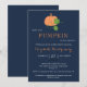 Nosso Pequeno Convite Para Chá de fraldas De Abóbora. Celebre a chegada da pequena de Elizabeth Montgomery com um charmoso chá de fraldas de abóbora. O convite apresenta um adorável design de abóbora e os carregares traseiros que as cores da abóbora também são azuis. Os detalhes incluem data do chá, hora, local do chá, informações de RSVP e detalhes do registro. Junte-se a nós para uma reunião confortável e festiva para honrar a futura mãe e a sua pequena abóbora!