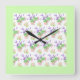 Um bonito relógio de parede floral, com um padrão de Rosas cor-de-rosa, Blossom Laranja Mock branco cremoso e Lavanda roxa, em uma borda verde-clara, de um design de cor d'água pintado à mão por Judy Adamson.