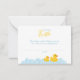 Adicione uma reviravolta divertida ao seu chá de fraldas com esta placa de fralda de pato de borracha amarela adorável. Apresentando um pato alegre e bolhas divertidas, é perfeito para celebrações de temas de pato. Esta placa de 3,5" x 2" é impressa em papel de alta qualidade e pode ser personalizada com seu próprio texto. Encoraje os hóspedes a trazer um pacote de fraldas para uma oportunidade de ganhar um prêmio especial, fazer seu evento agradável e prático.