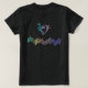 Psicodélica Dance Mania Music Notes T-Shirt. A dançarina espirra com um arco-íris de notas musicais a explodir a partir de dentro. Um vulcão de notas musicais emanando da mente, energia musical através do corpo. A mente do dançarino é livre. . Ele está dançando. A palavra dança está escrita acima em uma fonte groovy sexagenária de arte rock.