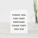 Este cartões de agradecimentos divertido e bonito apresenta a tipografia moderna e uma paleta clássica de cores preto e branco. A saudação à frente diz "obrigado por aquela coisa incrível que você fez". O dentro da placa é vazio, mas pode ser personalizado com seu próprio texto. Este é um cartões de agradecimentos perfeito para qualquer um! Todas as cores podem ser personalizadas (fundo e texto) ... Você pode até adicionar uma foto ao dentro, se quiser.
