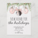 Informe familiares e amigos e deseje felizes festas no mesmo cartão com nosso cartão postal "Nova Casa para as Festas". O design apresenta alguns ramos de árvore de natal e enfeites pendurados com laços elegantes. Personalize com suas informações frente e verso.