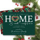 Este anúncio comovente mostra o ditado "Cartões de natal de Nossa Nova Casa Doce" com uma coroa de corações sagrada e morna colocada sobre um fundo verde. O anúncio é perfeito para enviar aos amigos e à família durante a temporada de férias para informá-los sobre seu novo endereço. A frente do anúncio apresenta o ditado e a coroa, e a parte de trás do anúncio tem um padrão de xadrez verde e vermelha de coordenação. O design geral é festivo e convidativo, e o anúncio certamente coloca um sorriso nos rostos de seus entes queridos.