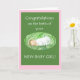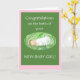 Um cartão de parabéns para o nascimento de uma nova menina, com um bebê dormindo e uma inscrição branca num fundo verde escuro, borrado de rosa.