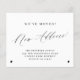 Simples e elegante anúncio de caligrafia em preto e branco novo barato de orçamento de endereço. ++++++++++ Fácil de personalizar com seu novo endereço residencial! +++++++++ LEIA ISTO ANTES DE COMPRAR! Este é um cartão de casamento de barato orçamentário impresso em uma folha de papel (cada folha tem um cartão). ++++ Se precisar de envelopes, escolha a OPÇÃO ENVELOPE. ++ Verifique duas vezes todas as informações e a ortografia do seu texto porque receberá exatamente o que você vê - ninguém mais verificará nada antes de imprimir. +++ Esta placa foi projetada para o tamanho de 4,5" x 5,6". Caso você escolha outro tamanho do cartão e o texto saia da página, tudo precisa ser corrigido antes de adicionar o produto ao carrinho.