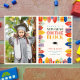 O tema da graduação "New Formando On The Block", escola elementar / pré-escola / jardim de infância, com ilustração de casas e prédios coloridos de bairro, em volta do texto, com sua foto personalizada à esquerda.