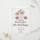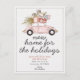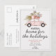 Informe familiares e amigos e deseje felizes festas no mesmo cartão com nosso cartão postal "Novo Lar para as festas". O design apresenta um carro antigo com uma árvore de natal e presentes no teto. Personalize com suas informações frente e verso.