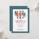 Árvore de Natal colorida com um preguiçoso, convite de festas jante com tipografia elegante sobre fundo verde-escuro.