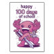 Design bonito com um axolotl vestindo uma mochila e segurando uma grande caneta com a citação "Feliz 100 dias de escola". Feliz 100º dia de escola ou jardim de infância.