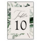 Cartões de mesa de casamento elegantes, botânicos, com o número da tabela aninhados em um quadro retangular cercados por eucalipto, samambaias e outros ricos verdes com fundo creme. Personalize o número de cada placa de mesa e adicione-o ao seu carrinho. Projetado para coordenar com nossa coleção de casamento Abundant Greenery.