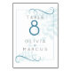 Número da Tabela de Casamento | Folhagem simples, azul pálida, por detrás do texto, com uma fina estrutura e espirros em cor azul-suave ao sotaque - Esta é parte de uma suite de casamento coordenada.