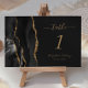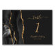 A borda esquerda deste cartão de número de mesa de casamento moderno e elegante apresenta uma borda de ágata em aquarela preta aparada com brilho dourado falso. O texto personalizável combina caligrafia dourada, e fontes itálicas e copperplate em um fundo preto-claro.