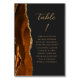 A borda esquerda desta elegante e moderna placa de número da mesa de casamento apresenta uma borda de cor de água laranja queimada, aparada com falsa brilho dourado. A palavra "mesa" aparece em um guião de escrita manuscrita dourada sobre fundo escuro. Adicione os nomes dos seus convidados que estão atribuídos a cada mesa.