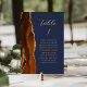 A borda esquerda desta elegante e moderna placa de número da mesa de casamento apresenta uma borda de cor de água laranja queimada, aparada com falsa brilho dourado. A palavra "mesa" aparece em um guião de escrita manual dourada sobre um fundo azul marinho. Adicione os nomes dos seus convidados que estão atribuídos a cada mesa.