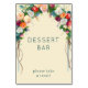Este sinal de mesa de casamento apresenta um charmoso design de arco floral com uma variedade de flores e folhagens coloridas, criando uma atmosfera vibrante e convidativa. O layout é equilibrado, com o texto "DESSERT BAR" exibido de forma proeminente em uma fonte serifada, seguido por "please take a treat!" em um estilo sans-serif mais simples, ambos em uma cor azul-turquesa suave que contrasta lindamente com o fundo creme. A técnica de ilustração digital dá a ele uma aparência polida e moderna, perfeita para adicionar um toque de elegância à sua celebração. Ideal para casamentos ou reuniões festivas, este sinal define um clima alegre e acolhedor, incentivando os convidados a se deliciarem com doces.