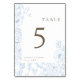 Moderno quadro de arte em linha floral, azul francês e número de mesa de casamento de dois lados bronzeado.