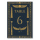Design azul-marinho profundo com borda de hieróglifos dourados, colunas de papiro e um disco solar alado acima das asas da Ísis dentro de um cartucho. O número da mesa é editável para qualquer mesa. Coordena com cartões de lugar egípcios correspondentes, menus e gráfico de assentos.