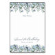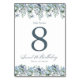 Flores azuis poeirentas criam bordas de cima e de baixo nesta elegante placa de número de mesa. A caligrafia clássica adiciona um belo toque. Este artigo é parte da coleção floral de Azul Dusty