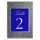 Script de caligrafia simples e moderno, número de mesa glitter prateado elegante e azul real.