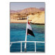 Bandeira egípcia do iate de prazer "Panorama" no fundo da água azul do mar Vermelho e carros de estacionamento