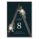 Um cartão de número de mesa floral boho com uma bela estrutura pirâmide de ouro rosa com botânicos de rosa de safra assimétricos.