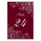 Um estilo popular em burgundy e cinza prateado. Os redemoinhos florais e floreios podem adicionar um visual clássico ao seu casamento. Números grandes são fáceis de ler e ajudarão seus convidados a localizar sua mesa.