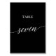 Este elegante branco na mesa sete da caligrafia negra é perfeito para um casamento simples. A design neutra apresenta uma carta minimalista decorada com tipografia romântica e caprichosa. A placa impressão na frente e atrás (lado duplo). Os outros números de tabela na coleção são vendidos separadamente.